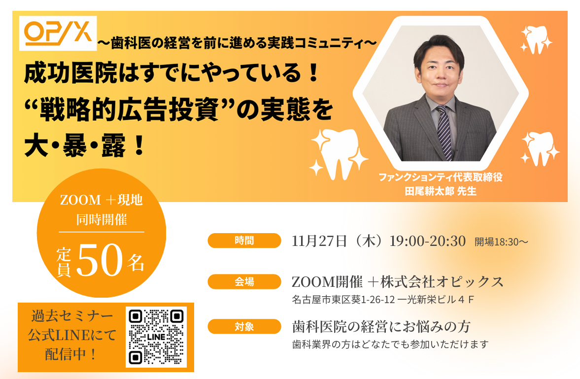 歯科医師としてだけでなく歯科専門のWeb制作・マーケティング支援を行う会社の代表取締役といった、歯科現場・支援側の両サイドからの目線で、歯科医院経営には欠かせない広告などの投資についてお話しして頂きます!経営者の先生方、御開業予定の先生など必見です✨